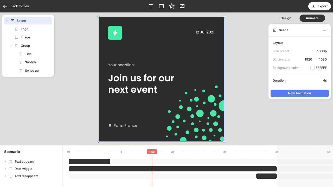 Whether you are designing Instagram stories, email visuals, blog illustrations, videos to promote your product, or logo animations, Jitter helps you make them truly outstanding.